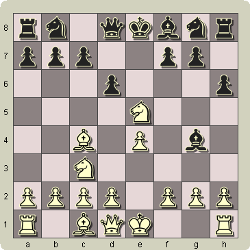 1.e4 e5 2.Sf3 d6 3.Lc4 Lg4 4.Sc3 h6
