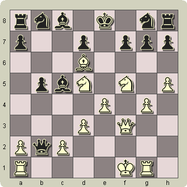 1.e4 e5 2.f4 exf4 3.Lc4 Dh4+ 4.Kf1 b5? 5.Lxb5 Sf6 6.Sf3 Dh6 7.d3 Sh5 8.Sh4 Dg5 9.Sf5 c6 10.g4 Sf6 11.Tg1! cxb5? 12.h4 Dg6 13.h5 Dg5 14.Df3 Sg8 15.Lxf4 Df6 16.Sc3 Lc5 17.Sd5 Dxb2 18.Ld6 Lxg1 19.e5! Dxa1+ 20.Ke2 Sa6 21.Sxg7+ Kd8 22.Df6+ Sxf6 23.Le7# 1-0