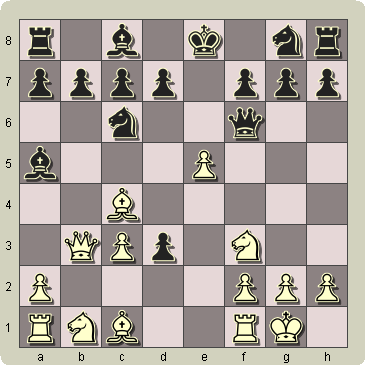 1.e4 e5 2.Sf3 Sc6 3.Lc4 Lc5 4.b4 Lxb4 5.c3 La5 6.d4 exd4 7.O-O d3 8.Db3 Df6 9.e5 Dg6 10.Te1 Sge7 11.La3 b5 12.Dxb5 Tb8 13.Da4 Lb6 14.Sbd2 Lb7 15.Se4 Df5 16.Lxd3 Dh5 17.Sf6+ gxf6 18.exf6 Tg8 19.Tad1 Dxf3 20.Txe7+ Sxe7 21.Dxd7+ Kxd7 22.Lf5+ Ke8 23.Ld7+ Kf8 24.Lxe7# 1-0